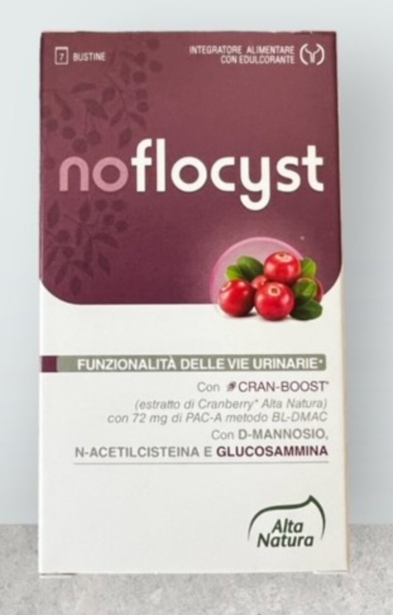 Noflocyst é un integratore alimentare a base di CRAN-BOOST (estratto di Cranberry Alta Natura con 103 mg di PACs, titolate con metodo BL-DMAC, di cui 72 mg di PAC-A) per la funzionalità delle vie urinarie ed un'azione antiossidante e per il drenaggio dei liquidi corporei.
