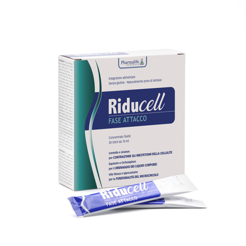 Riducell Fase Attacco è un integratore alimentare a base di estratti vegetali, in particolare ananas, orthosiphon, centella, vite rossa, equiseto e ippocastano utile per drenare i liquidi in eccesso, contrastare gli inestetismi della cellulite e supportare la funzionalità del microcircolo.
